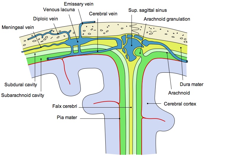 The relationship between the dura (epidural above – subdural below), the subarchnoid space and the cerebral cortex (brain) is shown here. This is where a brain bleed will occur.